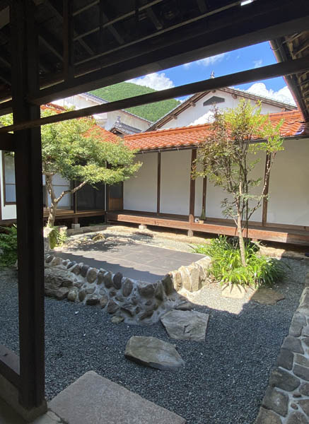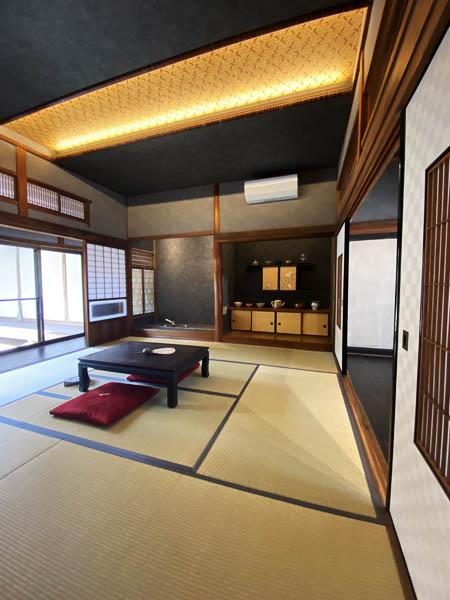 中庭の在る百年町屋をリノベーションしたものです。 玄関を入ると、左側に裏庭までつながる30m通路の先に庭木がみえます。 右側にも洗い出し石の5m通路があります。 履物を脱ぎ、五畳の部屋越しに中庭が見えます。 玄関から畳部屋に上がり左手、市松障子のクローゼット。 右手の襖を開けると八畳部屋には 床の間と違棚小襖の中にはTVが 隠れています。 冬は炬燵、夏は座卓に座りくつろぎ部屋になります。 玄関通路とハ畳の間に板間があり そこではmukの焼き菓子とgreen coffee豆、janat紅茶、日本茶が用意されてます。 ご自由に楽しんで頂けます。 左手に中庭を見ながら、渡り廊下先に6条の寝室、トイレ、 突き当たりの階段を上がると三畳の板間ライブラリーがあります。 寝室の西廊下を歩くと洗面所とお風呂がございます。 裏には小さな畑があります。